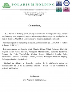 S.C. Polaris M Holding S.R.L. anunţă locuitorii din Municipiului Târgu Jiu care stau la casa şi sunt programaţi pentru ridicarea deşeurilor menajere şi sacul galben în ziua de Luni 13.04.2015 că acest lucru se va modifică după cum urmează:
