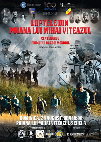 Evenimentul “Centenarul Primului Război Mondial. Reconstituirea istorico-militară. Luptele din Poiana lui Mihai Viteazul”, care va avea loc duminică, 26 august 2018, ora 16.00, în comuna Schela, Poiana lui Mihai Viteazul, este un proiect dedicat aniversării Centenarului Marii Uniri din 1918 şi evocării momentelor istorice parcurse de ţările române în timpul Primului Război Mondial, ca paşi premergători ai înfăptuirii României Mari, fiind finanţat de Ministerul Culturii şi Identităţii Naţionale.