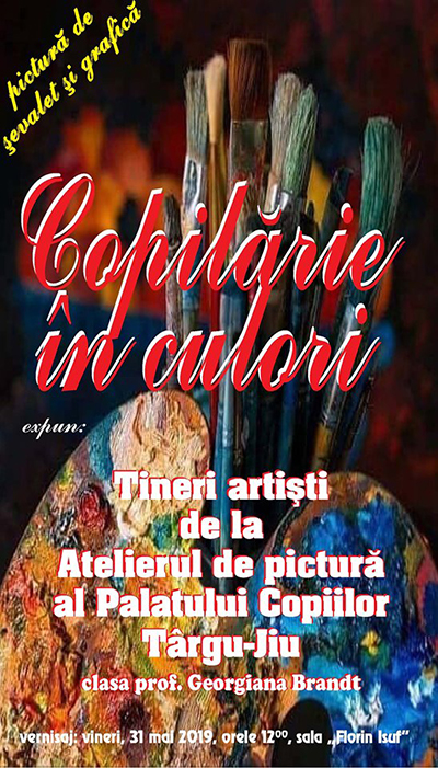 Tineri artişti de la Atelierul de pictură al Palatului Copiilor Târgu Jiu, clasa profesoarei Georgiana Brandt vor expune vineri 31 mai 2019, ora 12.00 în Sala „Florin Isuf” a Centrului Judeţean pentru Conservarea şi Promovarea Culturii Tradiţionale Gorj. Este vorba de picturi pe şevalet şi grafică.