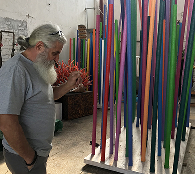 „Este cel mai important eveniment cultural din Europa. Festivalul internaţional Europalia are loc la Bruxelles şi reuneşte artişti din toate domeniile. Am aplicat pentru acest proiect pentru că acolo nu te duci că vrei tu să fii prezent. Bucuria a fost mare când am aflat că proiectul meu a fost acceptat. Face parte dintr-un curent artistic aflat în trend în momentul acesta. E vorba de implicarea artistului în problemele din societate, în salvarea mediului, a naturii. Ce se mai poate salva. Artistul are armele sale, prin ceea ce face, se implică şi trage un semnal de alarmă. Acest proiect MANIFEST a început exact cu doi ani în urmă în pădurea de la Poienari. Cu 4-5 ani în urmă am realizat tot felul de „instalaţii” cum le zic eu. Pe lacul Sâmbotin a fost un protest împotriva poluării apelor, pe Dealul de la Bumbeşti Jiu a fost un manifest pentru natură, apoi la Marea Neagră am fost tot aşa cu o „instalaţie” pentru o mare curată. Apoi am fost pe vârful Parâng, la Rânca, au fost mai multe locuri în care am fost cu acest MANIFEST. Aşa am ajuns la Poienari, unde mulţi colegi din ţară şi străinătate, voluntari, au venit şi am vopsit 600 de arbori ca manifest împotriva defrişărilor, a tăierilor abuzive pentru că nu avem nimic împotriva curăţării pădurilor. Au urmat alte expoziţii în ţară pe aceiaşi temă, dar şi la Veneţia, Lisabona, iar acum Chateau de Beloeil, care este un punct turistic extrem de căutat. Acolo vor fi expuse 100 de piese colorate la fel ca arborii de la Poienari. Sunt piese cilindrice de 6 metri înălţime şi aşezate aleatoriu pentru a crea un volum. Oamenii au posibilitatea să se mişte printre aceste elemente. E un fel de pădure mobilă, un fel de sculptură în spaţiu public şi un simbol al implicării în salvarea naturii”, ne-a declarat Mihai Ţopescu înainte de a pleca spre Bruxelles.