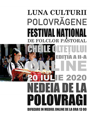 Pentru Festivalul naţional de folclor Cheile Olteţului s-au înscris 20 de participanţi. Festivalul va fi deschis on line cu un recital susţinut de câştigătorii ediţiei 2019: Manasiescu Mălina, marele trofeu al festivalului, Şandru Ioana, premiul I solist vocal şi Alexandru Marin, acordeon, premiul I solişti instrumentişti. Festivalul este organizat de Centrul Judeţean pentru Conservarea şi Promovarea Culturii Tradiţionale Gorj, în colaborare cu Primăria şi Consiliul Local Polovragi.
