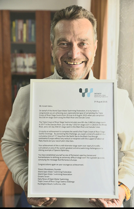 Dl. Avram Iancu, În numele World Open Water Swimming Federation, am onoarea să vă felicit pentru atingerea obiectivului dumneavoastră fără precedent, reuşind să finalizaţi Triple Crown of River Stage Swims în perioada 29 iunie – 8 august 2025, când aţi parcurs înot cei 556 km pe râul Main şi Canalul Dunării. Triple Crown of River Stage Swims a inclus: