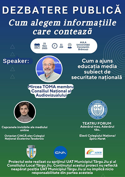 În cadrul proiectului, vineri, 21 noiembrie, ora 11:00, va fi organizată, în Aula Universităţii „Constantin Brâncuşi” din Târgu Jiu, dezbaterea publică intitulată „Cum alegem informaţiile care contează?”. La eveniment vor participa elevi, profesori, părinţi şi reprezentanţi ai autorităţilor publice, creând un spaţiu de dialog deschis privind consumul responsabil de informaţii şi mecanismele de prevenire a dezinformării. Evenimentul este deschis publicului, iar participarea este gratuită.